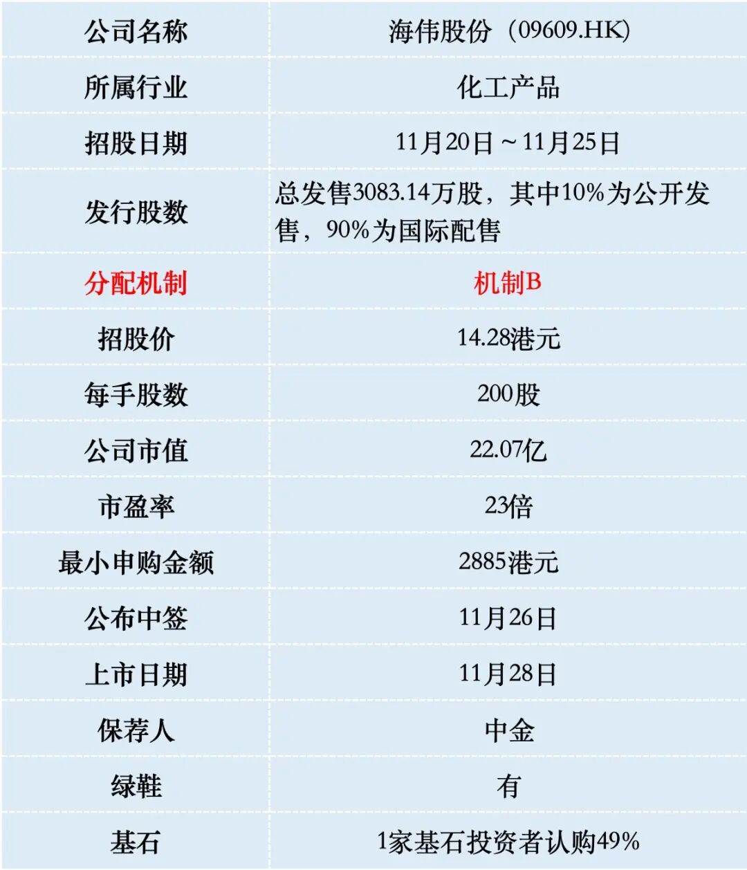 海伟股份本次IPO发行股份占全部股份比例的19.95%,按招股价14.28港元算,募资4.4亿,1家基石投资者锁定2.2亿,剩余流通盘2.2亿。