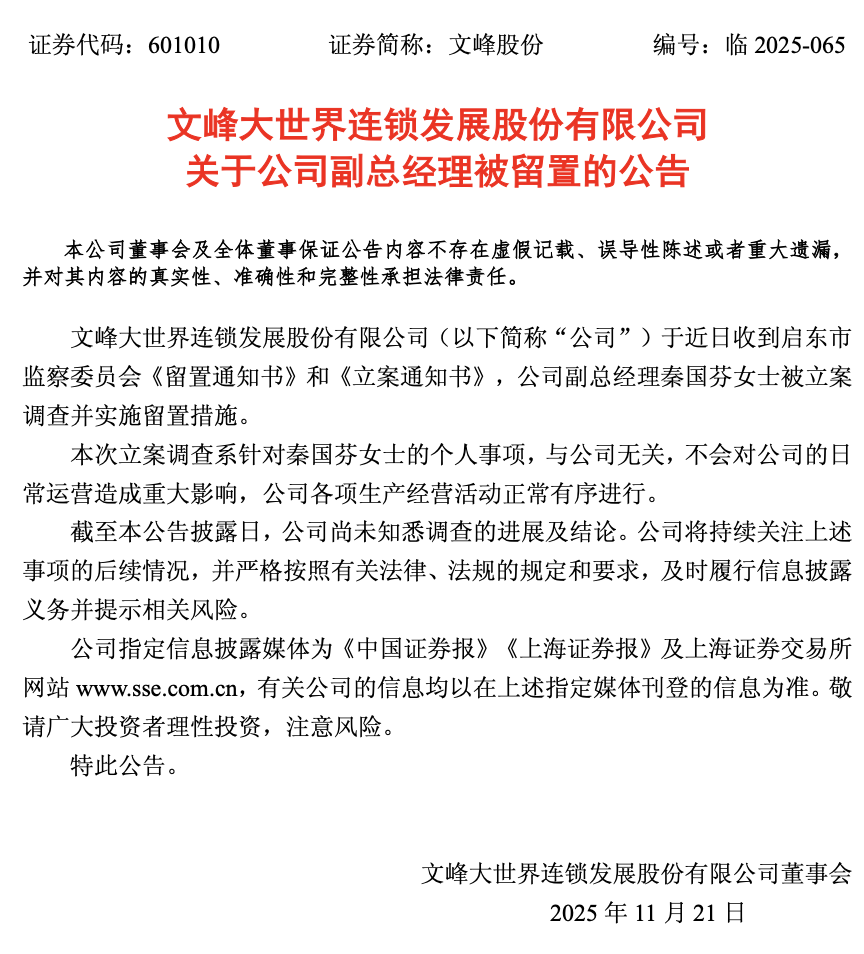 11月20日晚间,文峰股份公告,公司于近日收到启东市监察委员会《留置通知书》和《立案通知书》,公司副总经理秦国芬被立案调查并实施留置措施。