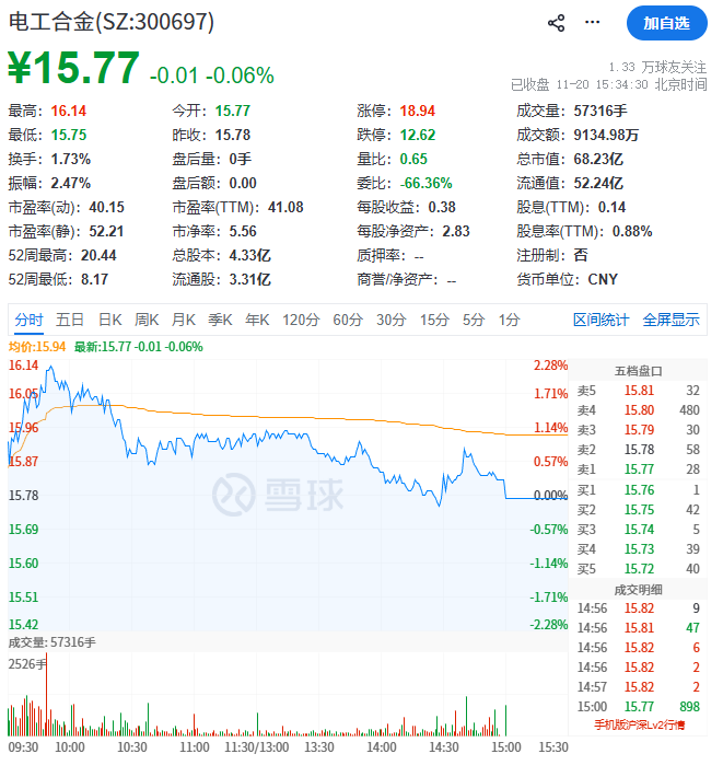 二级市场上,截至11月20日收盘,电工合金跌0.06%,报15.77元/股,总市值68.23亿元。