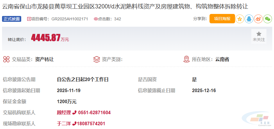 11月19日,据相关产权交易平台信息显示,云南省保山市龙陵县黄草坝工业园区3200t/d水泥熟料线资产及房屋建筑物、构筑物整体拆除转让,转让底价为4445.87万元。