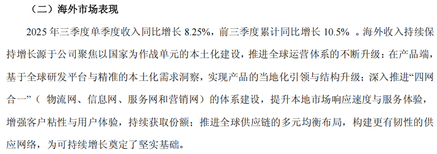 公司的毛利率达到27.2%,较2024年同期上升0.1个百分点。其中,国内市场聚焦极致成本,围绕“低成本、高效率”,构建成本竞争力目标到全流程落地体系,毛利率同比提升;