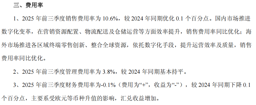 在期间费用率里,我们看到销售费用率持续优化,公司运营效率不断提升;财务费用率有所下降,主因是欧元等币种升值,汇兑收益增加。