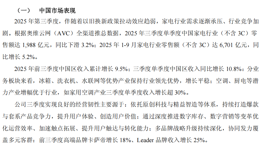 2025年10月31日海尔智家公布了2025年三季报:营收2340.54亿同比增长9.98%,净利润173.73亿同比增长14.68%,扣非净利润168.92亿同比增长15.03%;