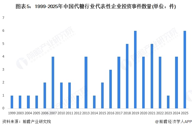 2017年以来,中国代糖行业代表性企业的投资热情逐渐提升,投资事件数量较2017年以前增加,2019年与2025年均达到8件,为近年来投资数量最多的年份。