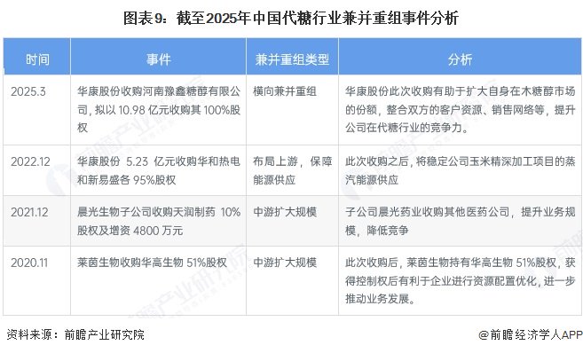 近年来,我国代糖行业发生的兼并重组事件多出于中游企业扩大规模、布局上游的目的,例如华康股份收购华和热电、新易盛,保障生产经营过程中的能源供应。截至2025年中国代糖行业主要并购事件汇总如下:
