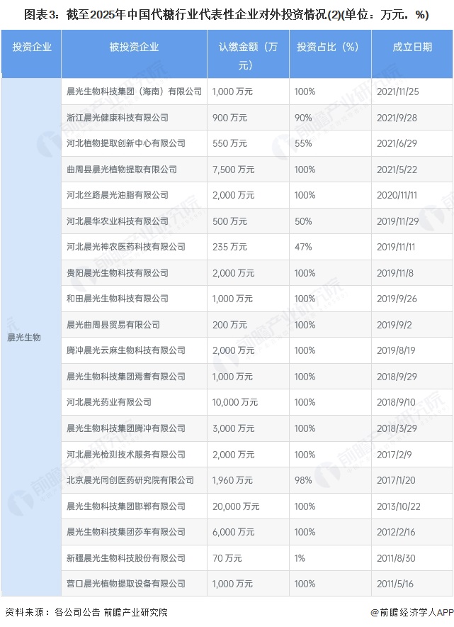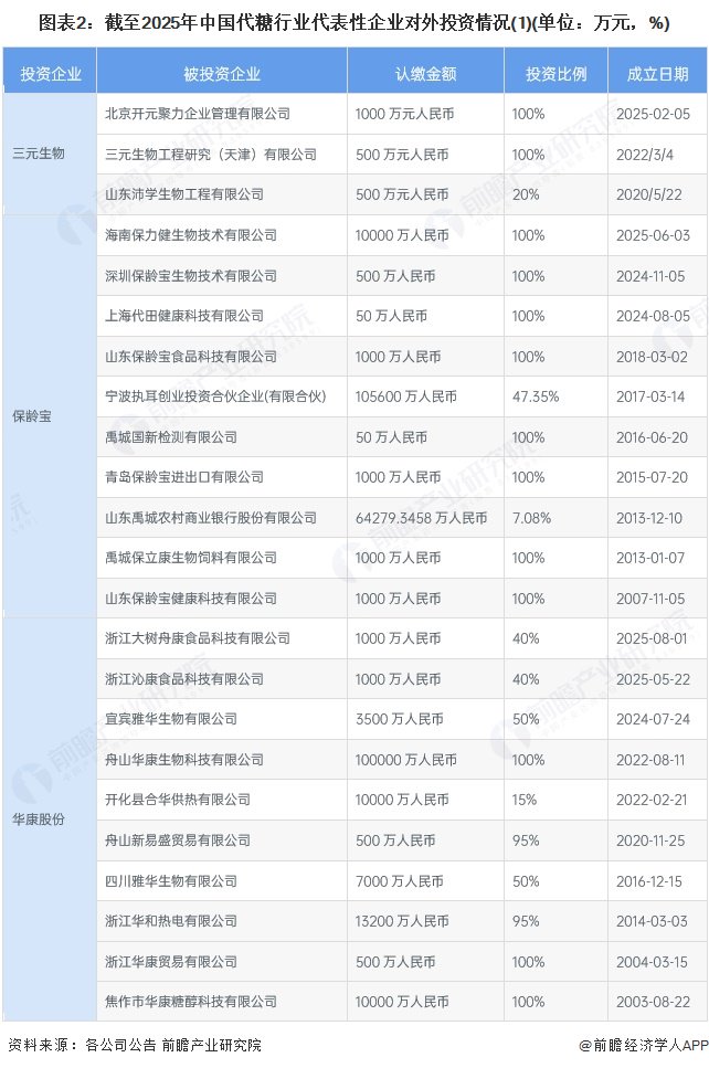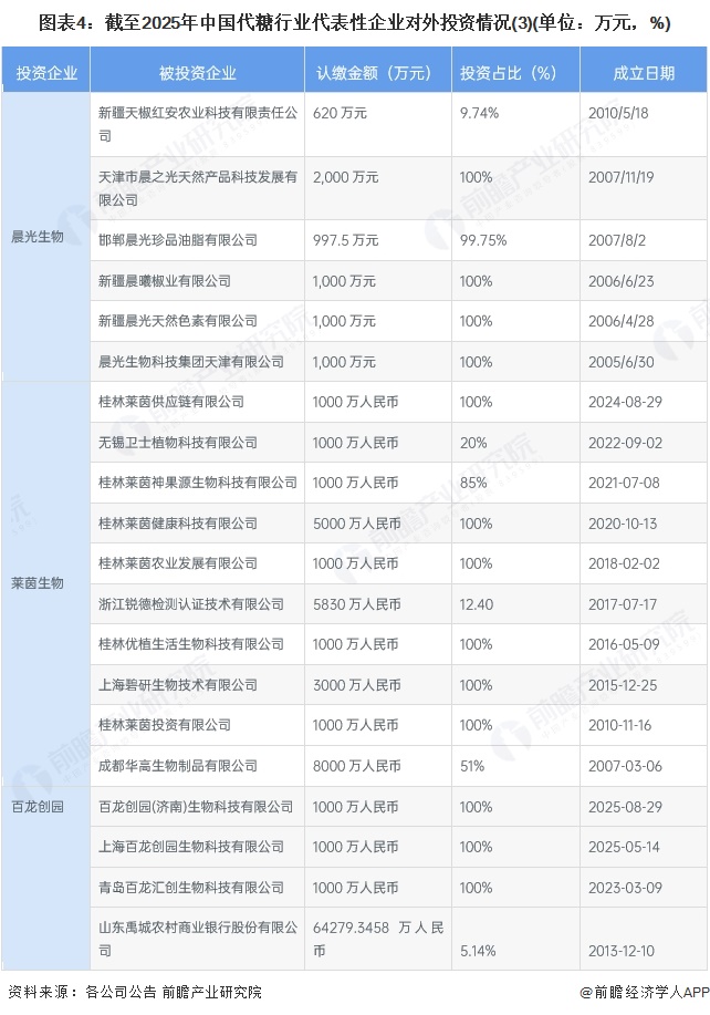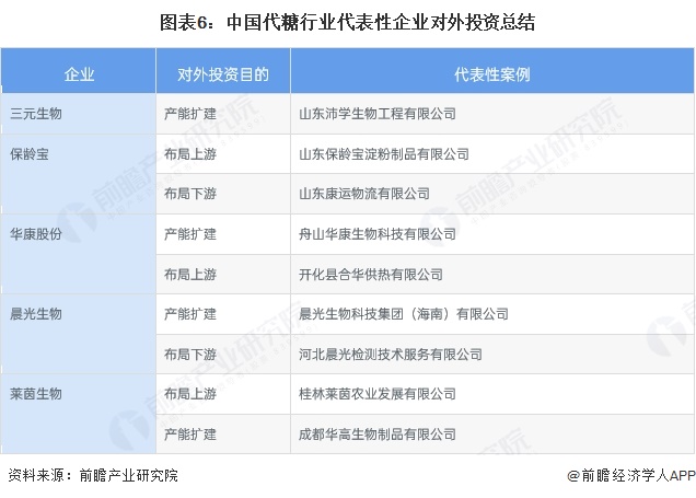 从中国代表性企业的对外投资来看,大部分企业投资的子公司主营为代糖及相关业务,也有部分投资企业为代糖上下游或者是其他业务领域的企业。中国代糖行业代表性企业对外投资情况汇总如下: