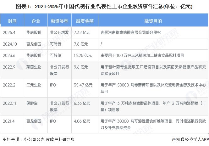根据代表性上市企业公告的梳理,代糖行业的上市公司融资手段主要有IPO、非公开发行股票和发行可转债。从整体来看,中国代糖行业上市企业的融资主要用于新建项目,提升企业产能。2021-2025年代糖行业代表性企业主要的融资事件如下: