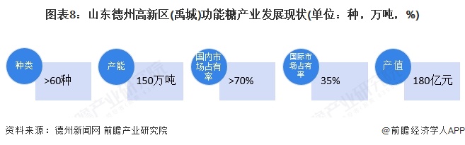 山东禹城是全球知名的代糖生产基地,主打功能糖(功能性低聚糖、功能性膳食纤维、功能性糖醇等)产品,产品类型超过60种,产能达到150万吨。禹城功能糖产品在国内外均有较强的竞争力,国内市场占有率达到70%以上,国际市场占有率在35%左右。