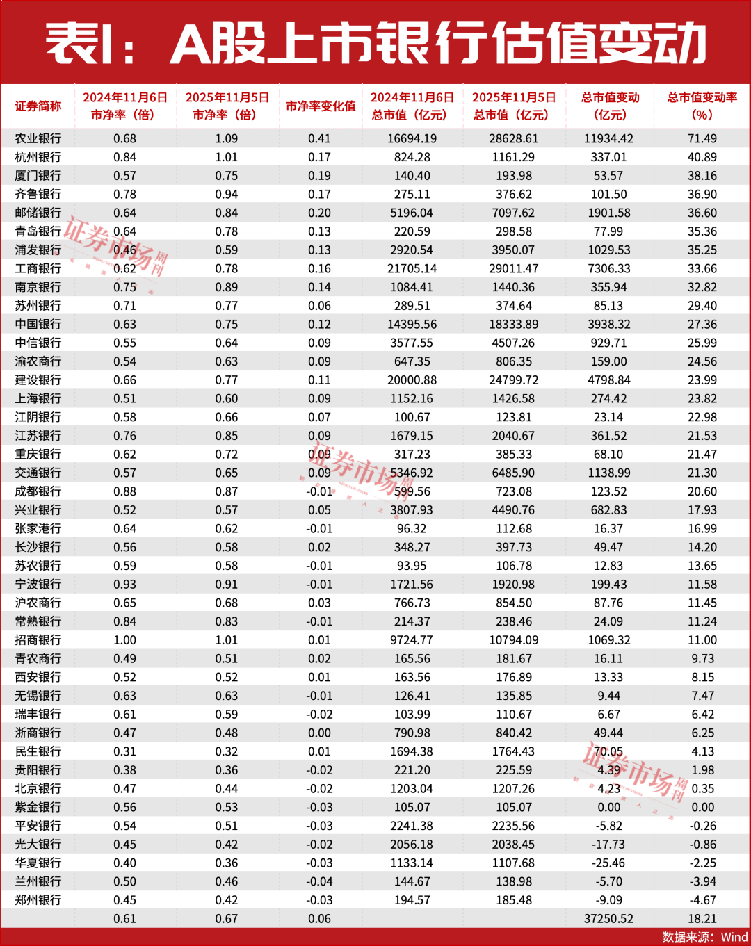 《市值管理指引》实施一周年,A股银行估值显著改善。农业银行以78%涨幅领跑,市净率突破1倍,成为市值提升典范。