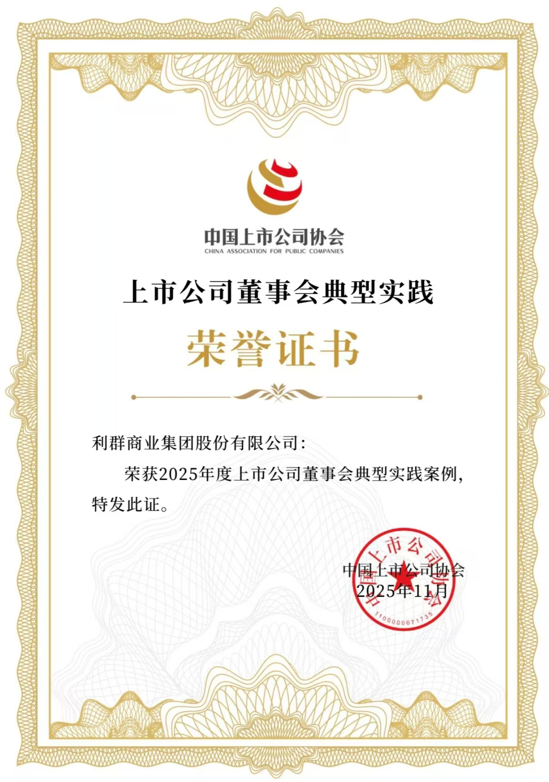 2025年11月21日,中国上市公司协会发布了“2025上市公司董事会最佳实践案例”征集活动结果,利群股份荣获“2025上市公司董事会典型实践案例”。