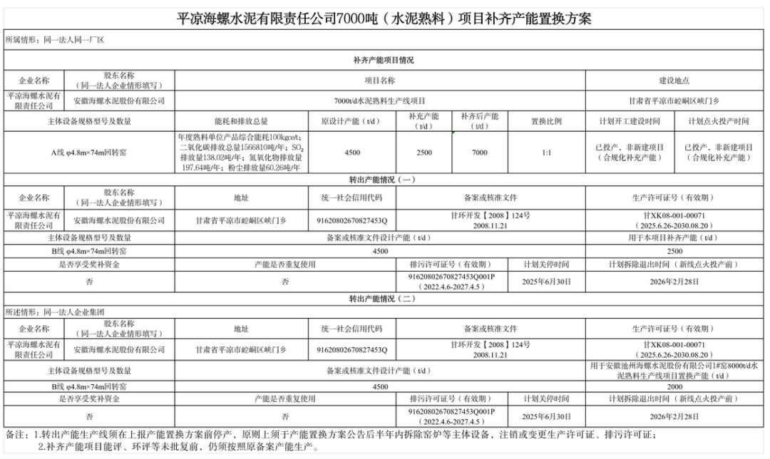 置换方案显示,平凉海螺水泥4500t/d熟料生产线补充产能2500t/d,补充后产能7000t/d,退出产能来同厂区一条4500t/d生产线,置换比例1:1。剩余2000t/d产能用于安徽池州海螺水泥1#窑8000t/d熟料生产线置换。