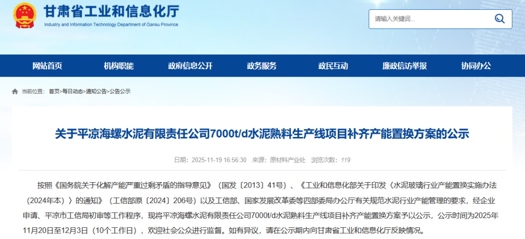 11月19日,甘肃省工信厅发布“关于平凉海螺水泥有限责任公司7000t/d水泥熟料生产线项目补齐产能置换方案的公示”。