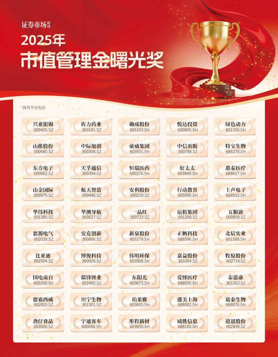2025年《证券市场周刊》市值管理“金曙光”评选圆满收官,八大权威奖项共授予521家上市公司。本届评选不仅是对企业价值创造、资本运作与沟通能力的综合检阅,更树立了高质量发展的市场标杆。