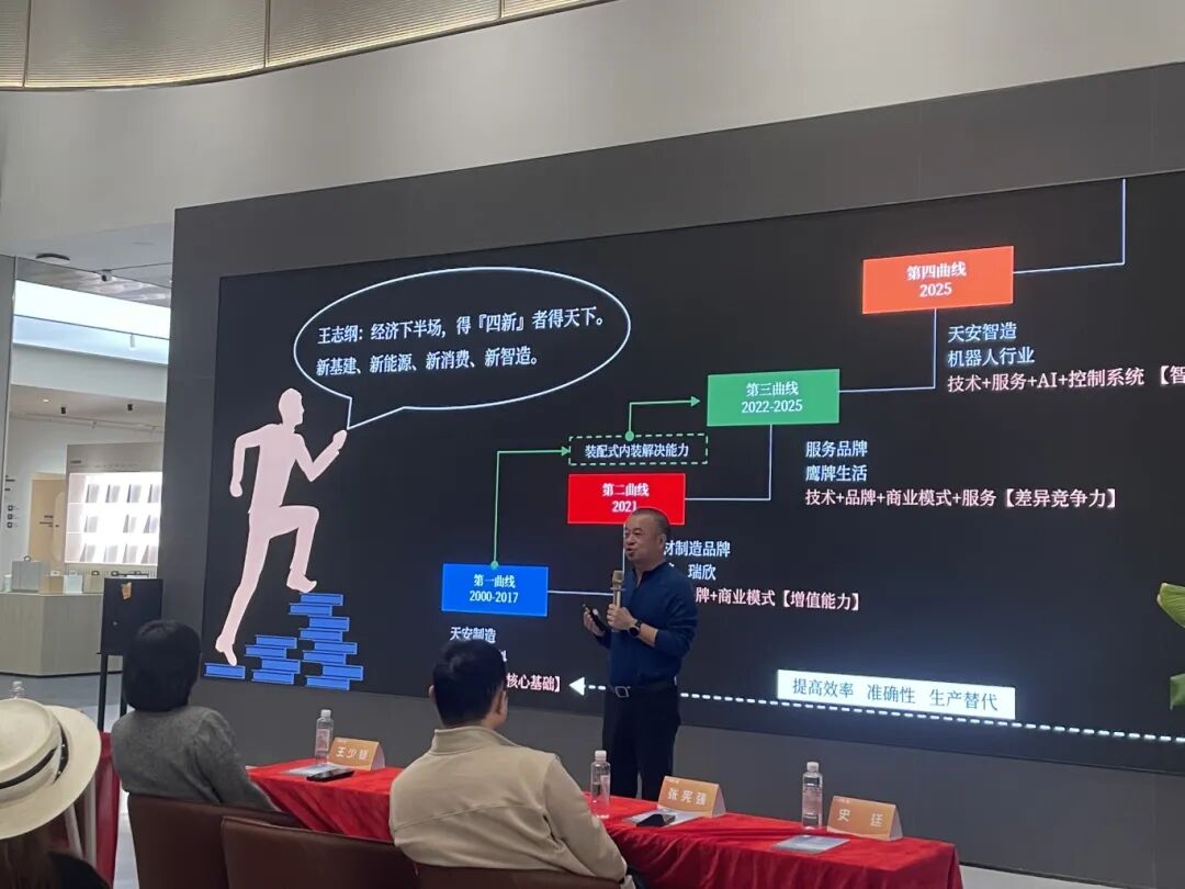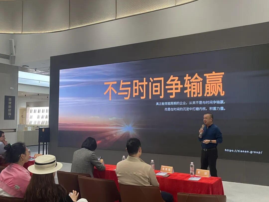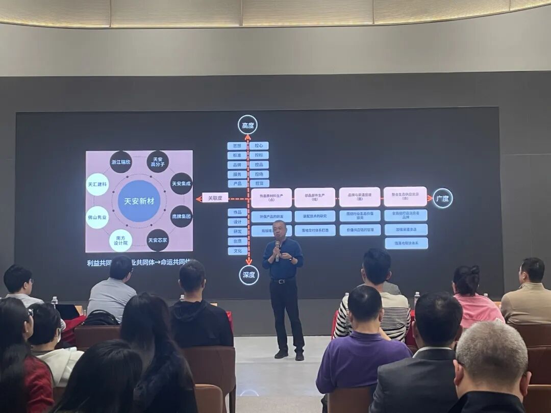 作为本次活动的特邀嘉宾,天安新材董事长吴启超以《不与时间争输赢》为题,展开了一场坦诚、深刻且极具启发性的主题演讲。吴董以天安新材的发展历程为背景,从战略、机制、文化、人才等角度出发,讲述他如何以技术为引领,带领天安新材实现三次战略转型并成功上市,通过并购成功组建了泛家居产业链。天安新材通过建立跨部门协同机制与数字化管理平台,不断提升企业精细化管理水平,成功实现被并购企业的业绩跃升。在掌舵人吴董的带领下,天安新材在时间的沉淀中打磨内核,积蓄力量,最终穿越下行周期实现逆势增长。