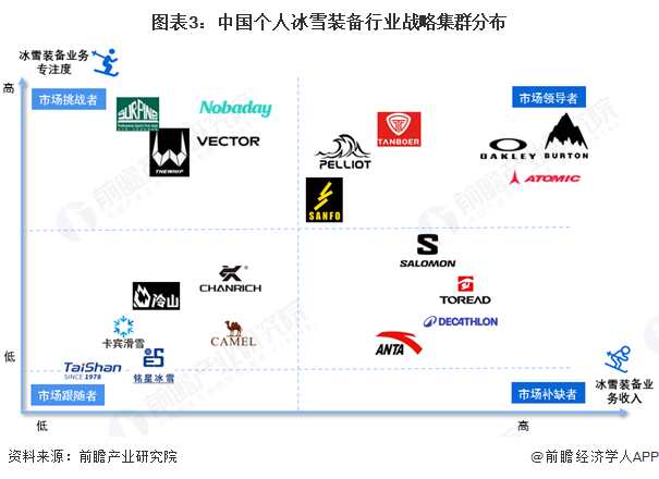 中国个人冰雪装备行业企业竞争集群根据冰雪装备业务收入和专注度,可以分为市场领导者、市场挑战者、市场跟随者和市场补缺者。