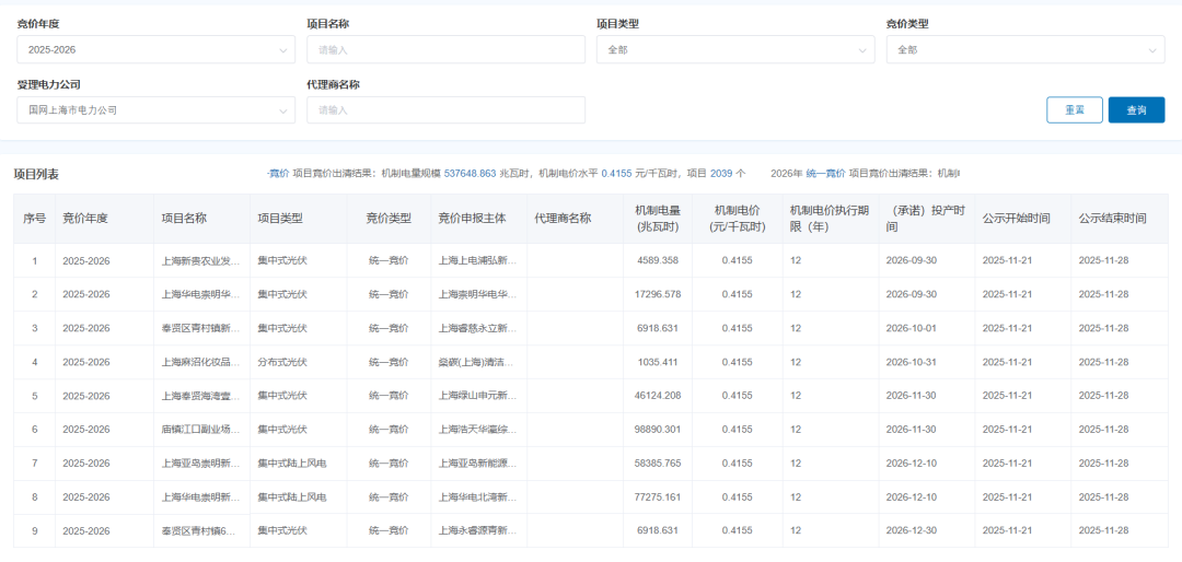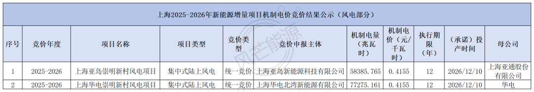 风芒能源获悉,11月24日,上海2025-2026年新能源增量项目机制电价竞价结果公示。