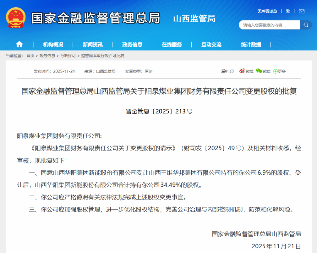 11月24日,国家金融监督管理总局山西监管局公布相关批复,同意华阳集团新能公司受让山西三维华邦集团持有的阳泉煤业集团财务公司(下称“阳煤财务公司”)6.9%的股权。受让后,华阳集团新能公司合计持有阳煤财务公司34.49%的股权。