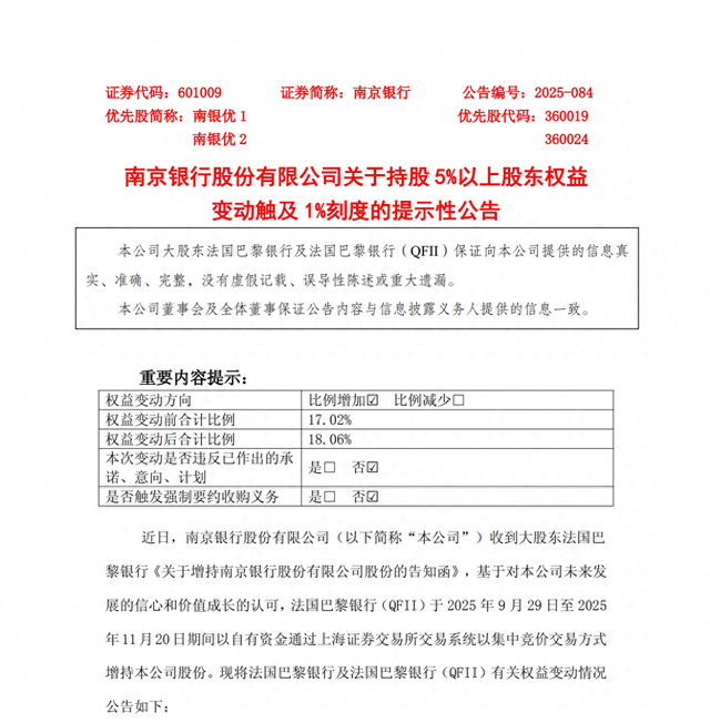 公告称,法国巴黎银行(QFII)于2025年9月29日至11月20日期间,通过集中竞价交易方式增持该行股份约1.28亿股,占该行总股本的1.04%。此次增持完成后,法国巴黎银行(QFII)的直接持股比例由原本的4.27%上升至5.31%。结合法国巴黎银行直接持有的12.75%股份,法国巴黎银行及其一致行动人对南京银行的合计持股比例由17.02%增加至18.06%,触及1%的权益变动刻度。