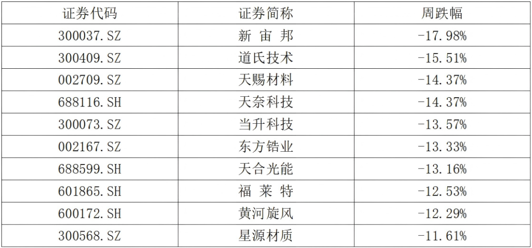 新宙邦随指数调整,全周下跌17.98%。公司近期发布三季度报,有机氟业绩短期承压,长期看好产品放量与3M替代机遇终端需求复苏不及预期导致氟化液产品均价下跌,有机氟板块有所承压;但随着产品布局逐步落地叠加供需格局转好,有机氟长期向好。