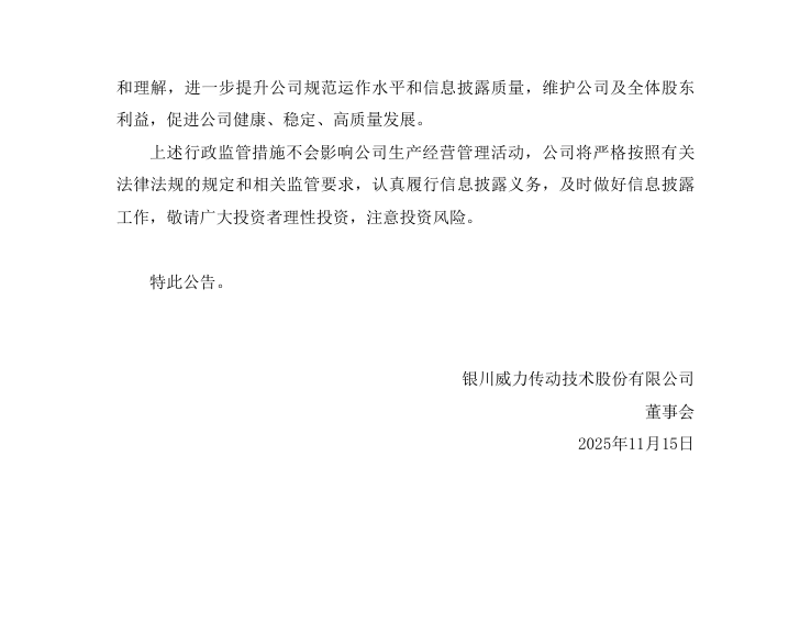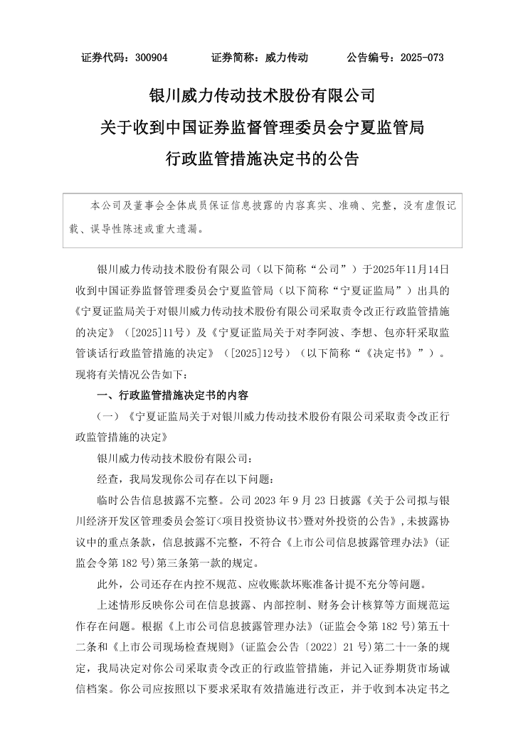 根据公告,威力传动于2025年11月14日收到中国证券监督管理委员会宁夏监管局(以下简称“宁夏证监局”)出具的《宁夏证监局关于对银川威力传动技术股份有限公司采取责令改正行政监管措施的决定》([2025]11号)及《宁夏证监局关于对李阿波、李想、包亦轩采取监管谈话行政监管措施的决定》([2025]12号)。