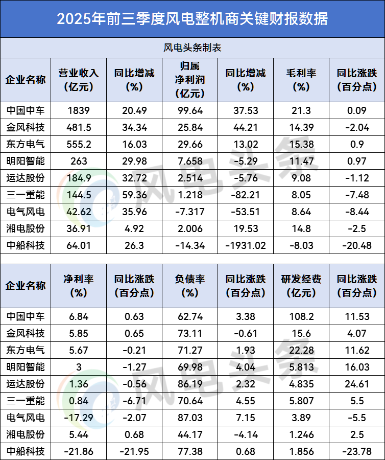 2025年前三季度,风电整机商在行业发展浪潮中展现出鲜明的 “双面性”:一方面,营收普遍增长、头部企业订单充足、研发投入持续加码,彰显出风电行业的韧性与潜力;另一方面,净利润承压、毛利率下滑、资产负债率高企等问题,也暴露出行业竞争加剧、成本压力攀升的现实挑战。
