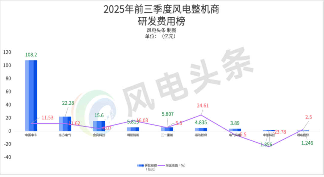 东方电气以22.28亿元的研发投入排名第二,第三名金风科技研发费用高达15.6亿元。
