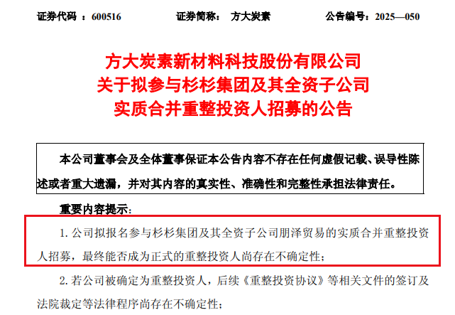 辽宁方大集团旗下方大炭素11月24日晚间公告称,公司董事会同意公司作为产业协同方参与杉杉集团及其全资子公司朋泽贸易的实质合并重整投资人招募,同时授权公司管理层代表公司拟定和提交重整投资的报名资料、签署尽职调查保密协议、开展尽职调查、提交《重整投资方案》等各项工作。