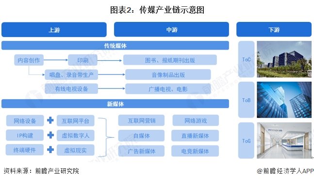 中国传媒产业的上游主要为印刷、有线电视设备、网络设备生产商;中游包括出版发行、电影、展览、广播电视、互联网营销、游戏等多个领域;下游分为ToC、ToB、ToG端。