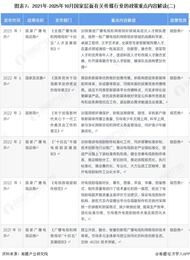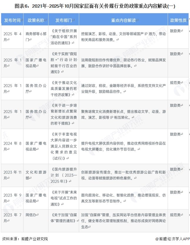 近年来传媒行业转型发展受到政策的重视,相关政策主要以规范类为主。截至2025年10月我国传媒行业重点政策如下: