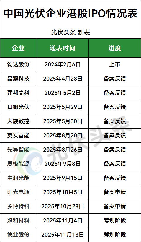 截至目前,2025年已经有13家光伏企业计划或者实施赴港上市行动,其中钧达股份在递表1年后,成功上市。晶澳科技、阳光电源、先导智能、罗博特科等光伏企业已经正式递表,聚和材料与德业股份则发布了拟赴港上市的公告。
