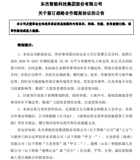 9月,东杰智能全资子公司与遨博机器人、马来西亚综合性巨头PTTSG正式签署框架协议。该协议明确锁定未来在智能制造、智慧物流领域的系统集成项目,总额不低于20亿马币(约合人民币33.87亿元),实现从“硬件集成”到“智能赋能”的升维。