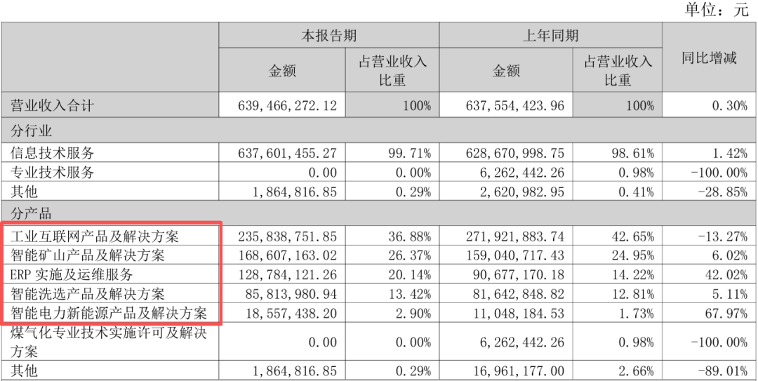 再到今年上半年,公司的5项主营业务分别是工业互联网业务、智能矿山业务、智能洗选业务、智慧电力新能源业务、ERP实施及运维服务。