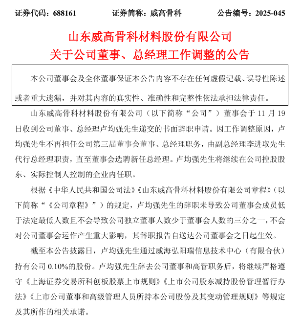 11 月 20 日,威高骨科(SH688161)公告,因工作调整原因,卢均强不再担任公司第三届董事会董事、总经理职务,由副总经理李进取代行总经理职责,直至董事会选聘新任总经理。卢均强将继续在公司控股股东、实际控制人控制的企业内任职。