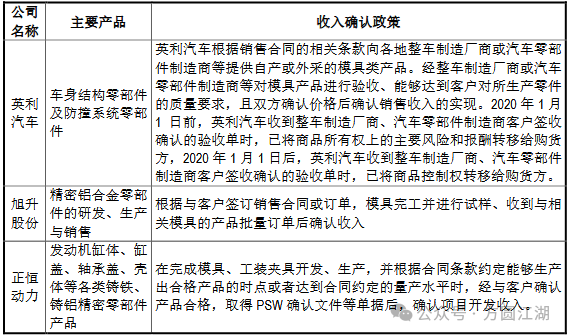 可比公司新泉股份和常熟汽饰的部分摊销、部分销售模式下的收入确认政策以及岱美股份按直线法分摊确认收入的收入确认政策为将模具开发业务作为属于在某一时段履行的履约义务进行会计处理。如前分析,发行人按客户要求的设计规格制造模具,在模具制造完成并能够批量生产符合客户质量要求的零件,经与客户确认产品合格时点,作为该项业务的控制权转移时点,并一次性确认收入,符合会计准则的规定。此外,部分汽车零部件行业上市公司对模具业务采用和发行人类似的收入确认政策,具体如下: