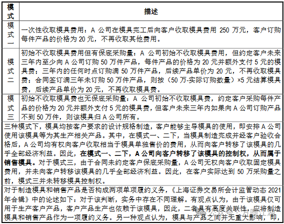 上海证券交易所于 2021 年发布的《上海证券交易所会计监管动态 2021 年合辑》中第二部分“典型案例研究”之“(一)收入系列”之“问题 3 定制模具并销售产品的会计处理”对模具销售的三种模式中模具控制权是否转移、制造模具和销售产品是否构成两项单项履约义务进行了分析,具体如下: