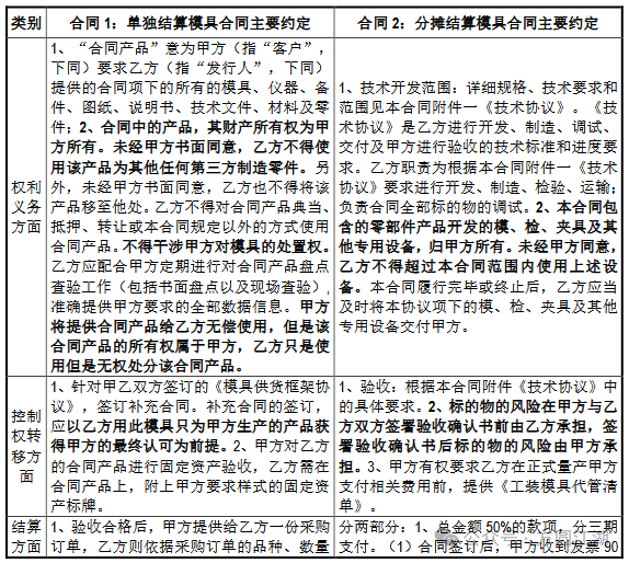 鉴于公司与客户签署的模具合同较多,格式略有不同,故公司就两类模具合同分别选取样本进行对比分析。公司模具合同中关于权利义务、控制权转移以及结算方式的约定主要内容如下: