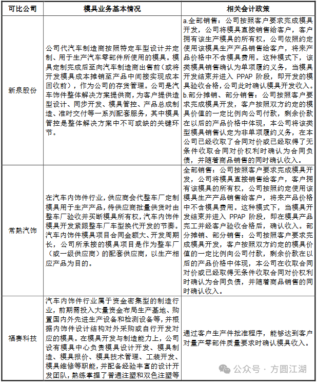 可比公司与发行人同属汽车内饰行业,按行业惯例,在承接客户汽车内饰件产品新项目时,一般需要为客户专门设计、开发新的模具,可比公司与公司的具体模具产品虽存在差异,但模具业务背景一致。由上表可见,岱美股份采用直线法分摊确认收入,常熟汽饰和新泉股份按将来产品价格中是否含模具费用分别采取一次性全部确认收入和部分分摊、部分销售的方式确认收入,福赛科技为量产达到客户对量产零部件质量要求时一次性确认模具收入。同行业可比公司对模具收入确认方式不同,公司与福赛科技确认方式基本一致。