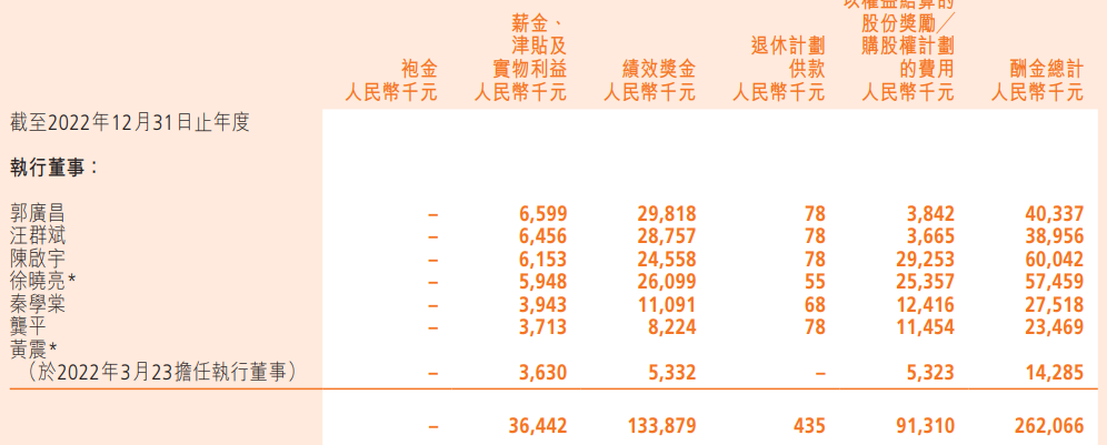 2024年度:吴以芳(董事长)报酬为436.62万元,王可心(联席董事长)报酬为534.33万元,关晓晖(副董事长)报酬为371.25万元,文德镛(首席执行官)报酬为409.1万元,王兴利(执行总裁)报酬为985.73万元,张文杰(执行总裁)报酬为1023.61万元。