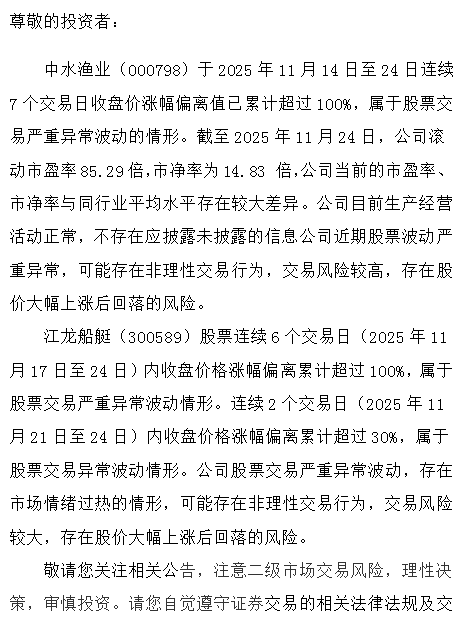 【风险提示】关于中水渔业(000798)、江龙船艇(300589) 交易风险提示公告