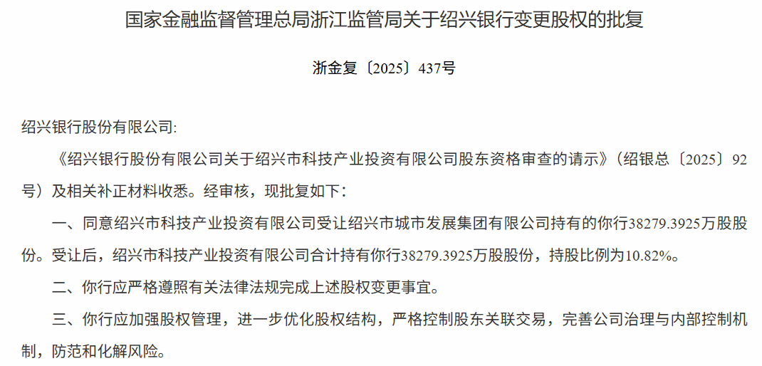 混业风云注意到,11月25日,国家金融监督管理总局网站显示,浙江监管局核准批复绍兴市科技产业投资有限公司(以下简称“科技产投”)受让绍兴市城市发展集团有限公司(以下简称“城发集团”)持有的绍兴银行38279.3925万股股份。受让后,科技产投合计持有绍兴银行38279.3925万股股份,持股比例为10.82%。