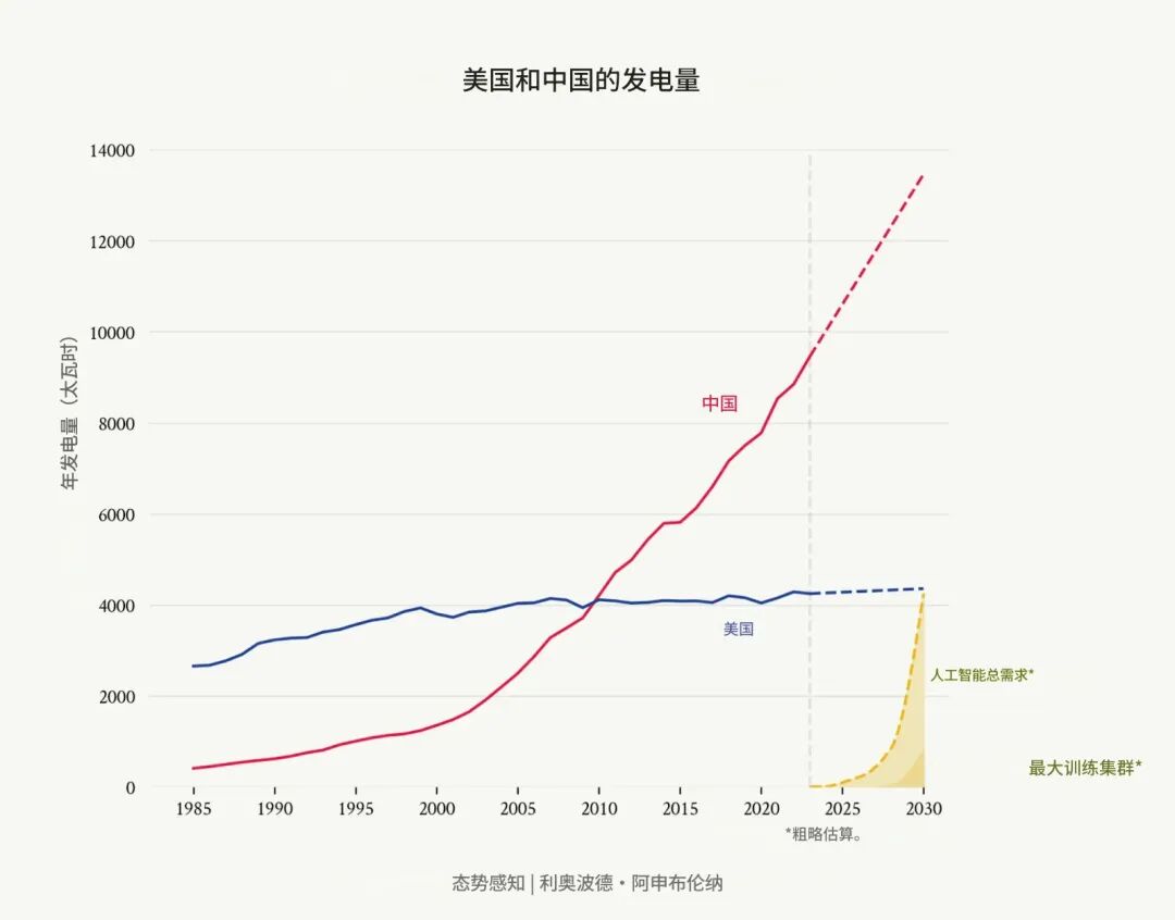 4、AI的尽头是电力。在电力方面,中国具有显著优势:1)在过去四分之一世纪中,中国每年新增的发电量相当于英国的总供电量。中国现在每年发电量超过美国和欧盟的总和。去年中国的电力容量增加了约400吉瓦,美国增量仅为中国增量的十分之一。2)中国正稳步成为世界上第一个主要依赖电力驱动的经济体。到2035年,非化石能源消费占能源消费总量的比重达到30%以上,风电和太阳能发电总装机容量达到2020年的6倍以上、力争达到36亿千瓦。3)高盛预计:到2030年,美国“有效备用电力容量”预计将降至15%的行业临界线以下。而中国预计将拥有约400吉瓦(GW)的备用电力,超过全球数据中心预期需求的三倍。《财富》杂志一条夸张的标题写道:“AI专家中国归来震惊不已:美国电网如此脆弱,竞赛或已终结。”