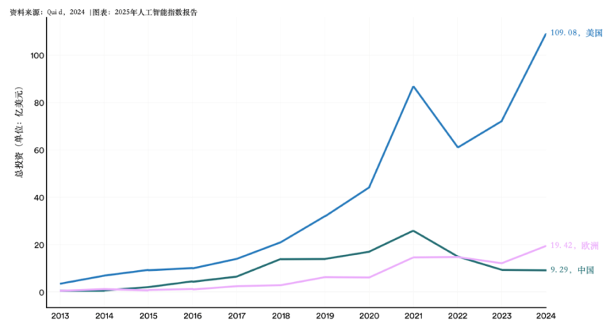 3、中国对AI的投入严重不足,有待爆发。在人工智能私人投资总额方面,2024年美国以1091亿美元的投资额排名第一,是排名第二的中国(93亿美元)的11.7倍。在对全球15个最大参与者的投资总额进行统计后,会发现美国的投资占比超过75%。
