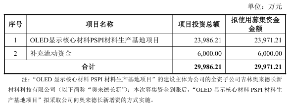 11 月 26 日,奥来德公告拟以简易程序向特定对象发行股票,募集资金总额不超 3 亿元,扣除费用后净额将专项用于 PSPI 材料生产基地项目及补充流动资金。该项目由公司全资子公司奥来德长新实施,总投资额约2.4亿元,建设期预计3年,核心为建设生产车间、搭建生产线及购置关键设备,旨在突破现有产能瓶颈,强化OLED核心材料产能布局,加速 PSPI 材料国产化替代。