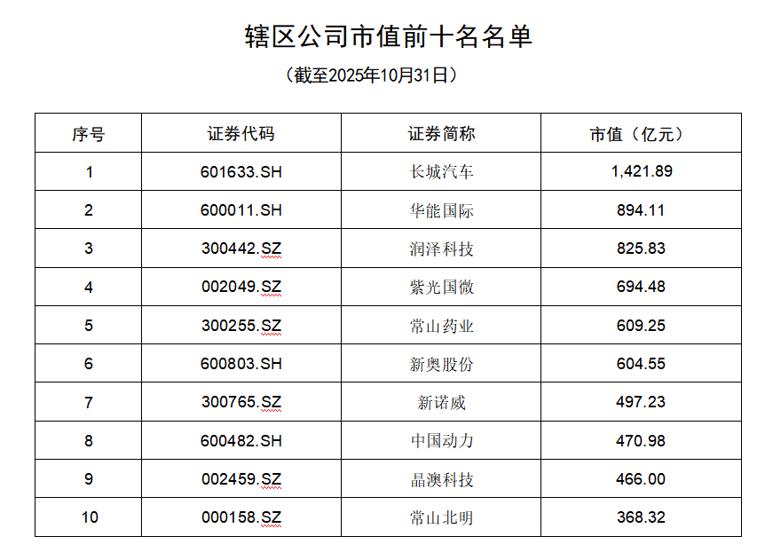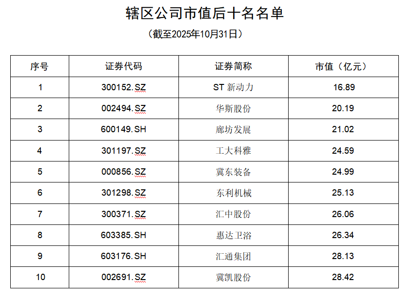 截至2025年10月31日,河北境内上市公司家数为84家,其中沪市27家(主板26家、科创板1家)、深市48家(主板24家,创业板24家)、北交所9家。上市公司总市值为14,329.09亿元,较年初增加19.18%,同比增加15.20%。截至2025年10月31日,河北辖区上市公司直接融资220.97亿元。