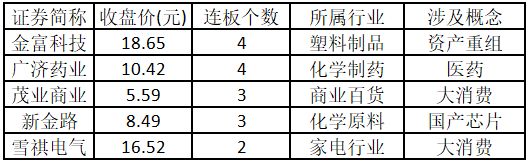 从连板情况来看,今日首板个股有43只;2连板的个股有6只;3连板及以上的个股有4只。今日连板数排名前5的个股包括金富科技、广济药业、茂业商业、新金路、雪祺电气,具体如下表所示。