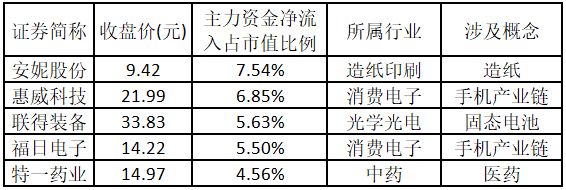 主力资金净流入金额占市值比例排名前5的个股分别为安妮股份、惠威科技、联得装备、福日电子、特一药业。