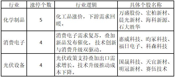 从行业特征来看,今日涨停板个股中,化学制品、消费电子、光伏设备行业的个股最多。