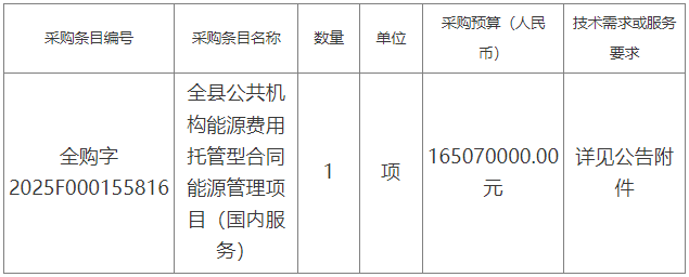 11月26日,江西省全南县公共机构能源费用托管型合同能源管理项目公开招标公告发布,采购预算1.65亿元,合同履行期限10年。