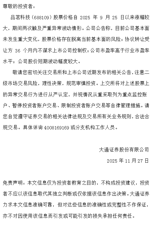 【风险提示】关于 品茗科技(688109)交易风险提示公告