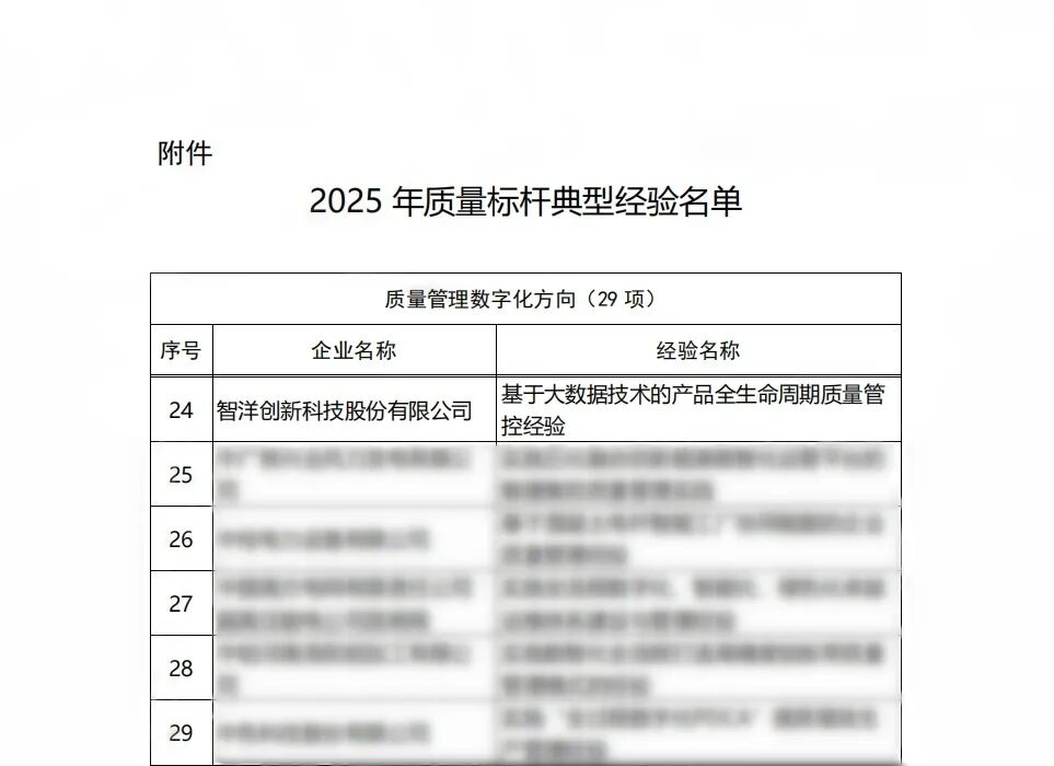 近日,中国质量协会正式公布了 “2025质量标杆典型经验” 入围名单。经过层层筛选与权威评审,智洋创新科技股份有限公司 凭借其在行业内领先的 “基于大数据技术的产品全生命周期质量管控经验” 成功入选质量管理数字化方向,荣膺国家级“质量标杆”称号!